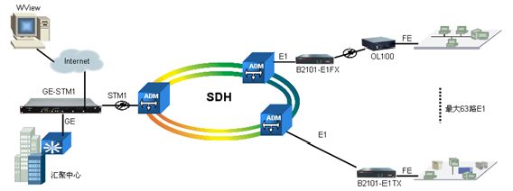 第一種作為最典型的應(yīng)用,可將GE-STM1部署于大客戶中心機(jī)房或其對(duì)應(yīng)的運(yùn)營(yíng)商機(jī)房,在用戶分支節(jié)點(diǎn)可放置單路E1協(xié)議轉(zhuǎn)換器B2101-E1TX或B2101-E1FX + OL100來完成每個(gè)分支節(jié)點(diǎn)的接入,通過帶外網(wǎng)管口管理GE-STM1設(shè)備。