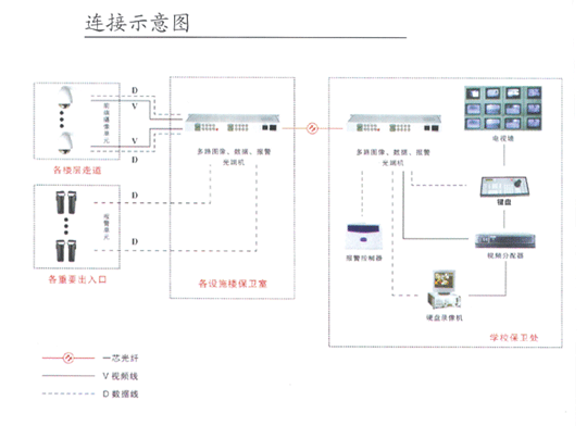 在校園監(jiān)控系統(tǒng)中由于校區(qū)大樓多、樓層高,布線復(fù)雜,而且遠(yuǎn)距離主要監(jiān)控中心遠(yuǎn),給監(jiān)控傳輸帶來了種種困難。因此將視頻,音頻,控制以及報(bào)警信號(hào)集中傳輸?shù)礁鱾(gè)保衛(wèi)室,然后保衛(wèi)室之間通過HS-VADE系列視頻、音頻、數(shù)據(jù)光端機(jī)來實(shí)現(xiàn)傳輸,解決校園的安全防范工作。
