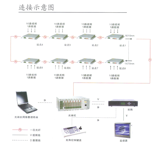 由于高速公路各個(gè)收費(fèi)站之間距離監(jiān)控中心比較遠(yuǎn),而且全線監(jiān)控需要上傳的圖象也比較多,所以采用漢信系列光端機(jī)通過接點(diǎn)級(jí)連的方式進(jìn)行圖象數(shù)據(jù)傳輸。